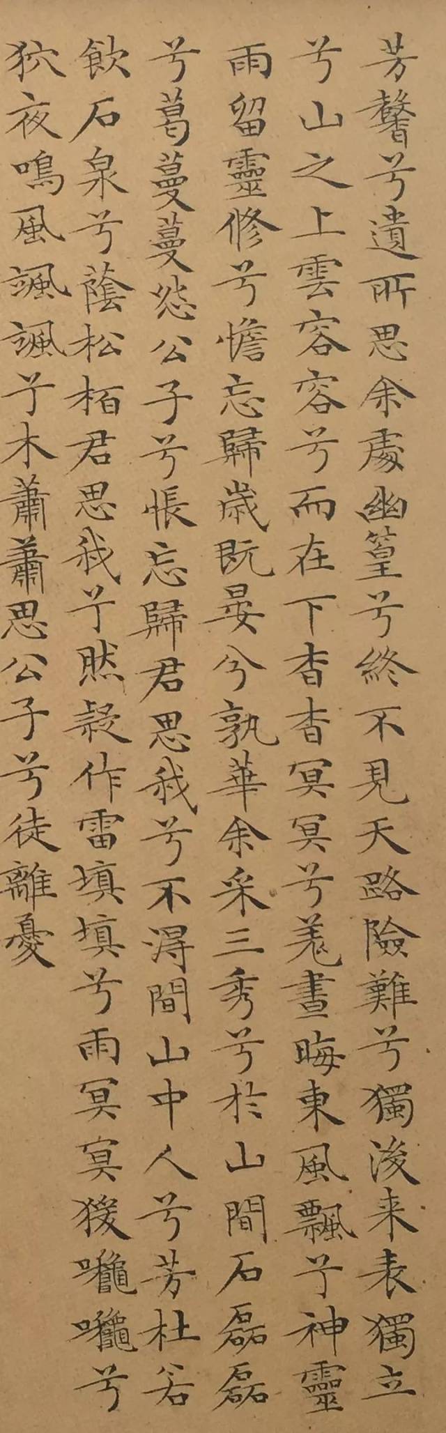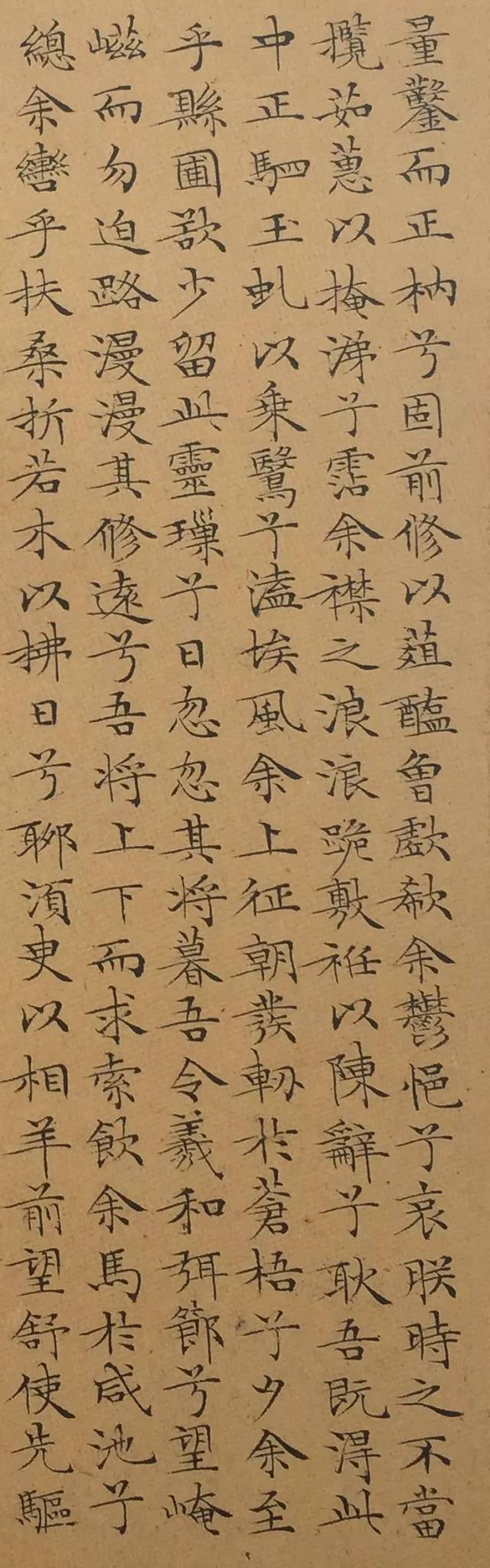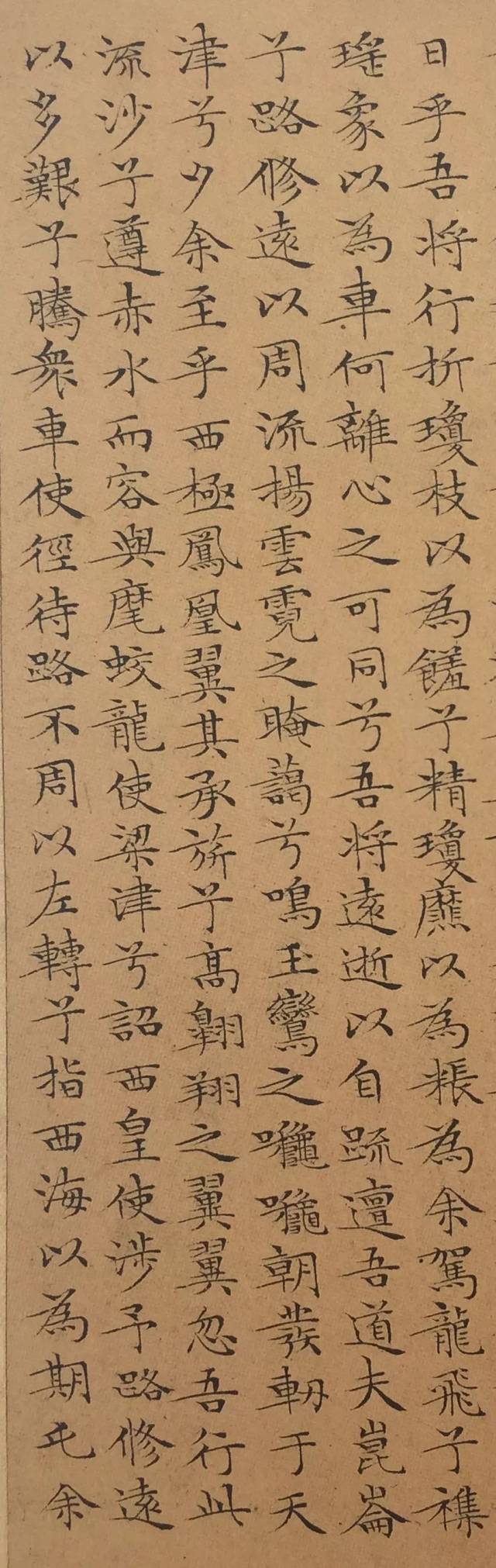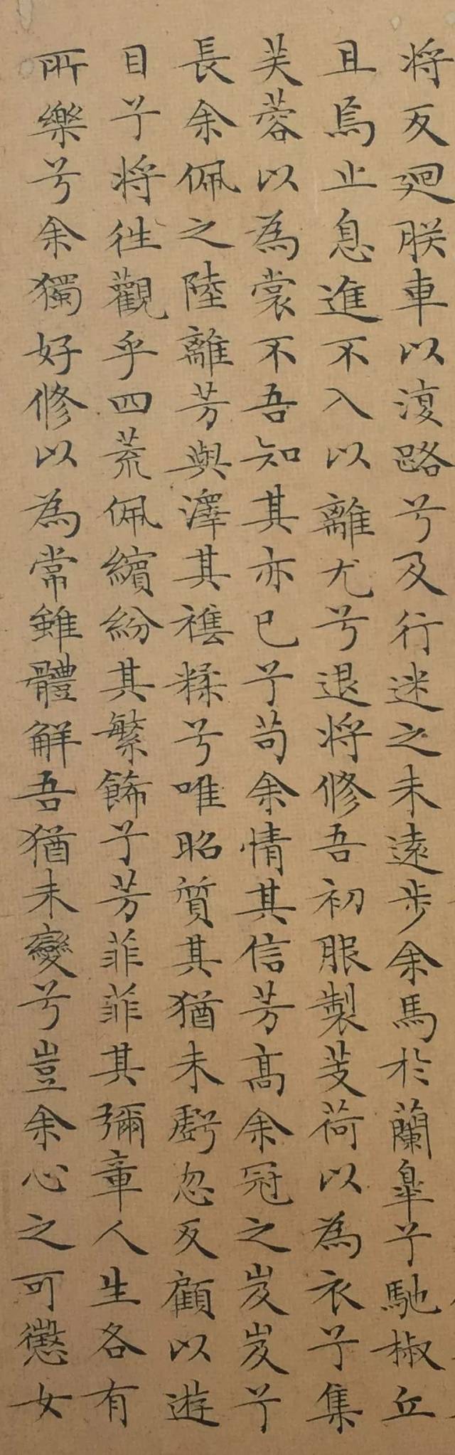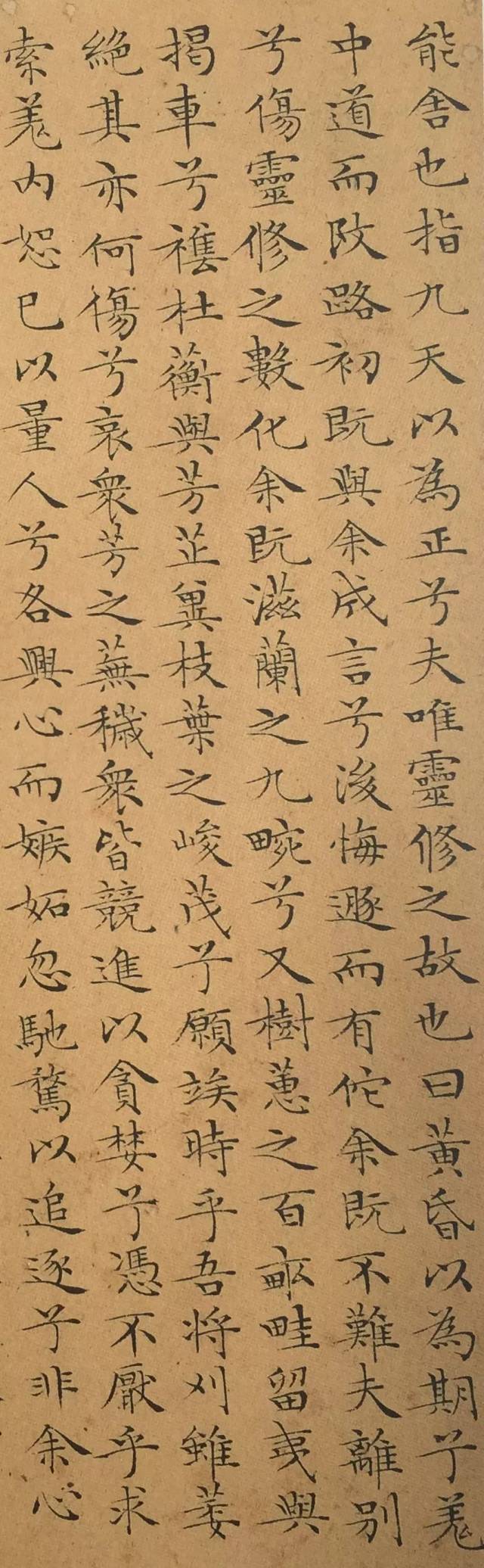 文征明《离骚经 九歌等》册,内容为屈原《离骚经》、《九歌》六首(东皇太一、云中君、湘君、湘夫人、司命、山鬼)《九章》一首(涉江)、及《卜居》、《渔父》。其书写风格风格渊源主要因受到钟繇《宣示表》、王羲之《黄庭》、以及元代倪瓒风格之影响,与北京故宫博物院藏84 岁所书《过秦论》笔法最为接近。而此册独到之处还在于,从章法上讲,他不像平时那样画界格来书写,而整体端雅整齐,行气自然流贯;结体则横向舒展,于平正之中求意态,在此正好印证了他自己的说法:“小字贵开阔,字内间架,宜明整开阔,一如大字体段。”运笔则工稳沉静,从容不迫,于整练之中,虚和舒徐之气浮现毫端,尤其横画起笔细若针尖麦芒,势若游丝飘忽于晴空。通篇字形大小如一,确如蝇头,乃属其小楷作品现存传世最小者,足见其工夫之炉火纯青,让人想象其明窗净几之下神怡务闲之况。