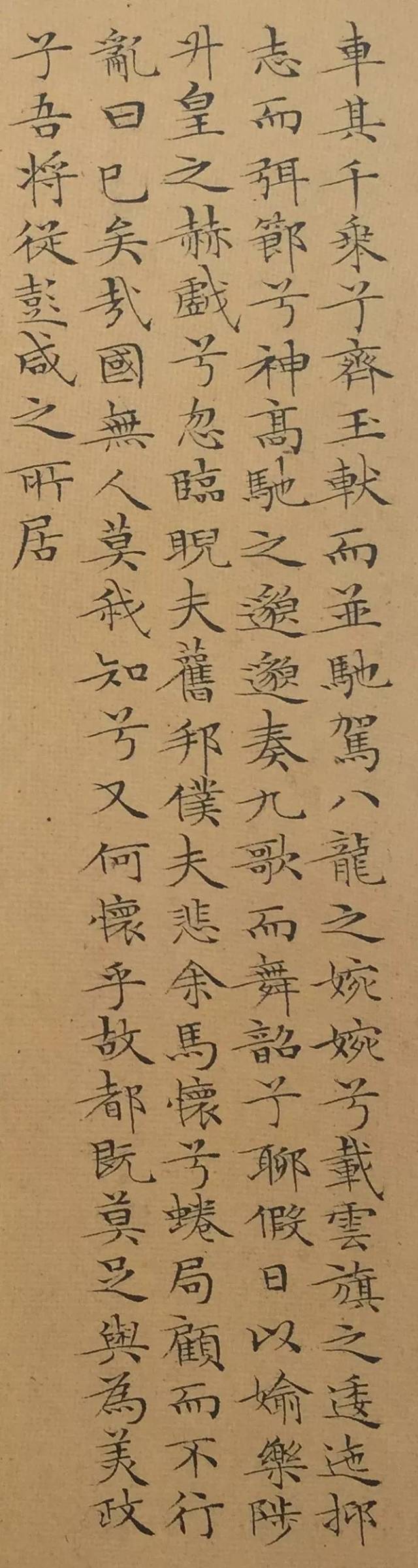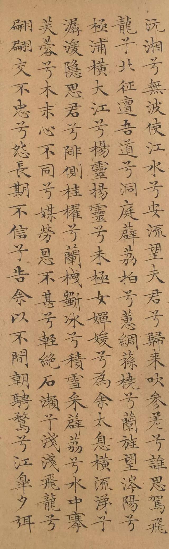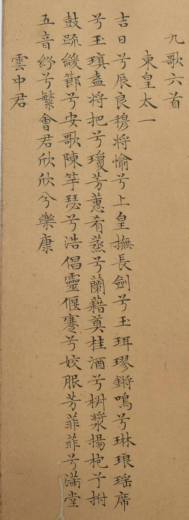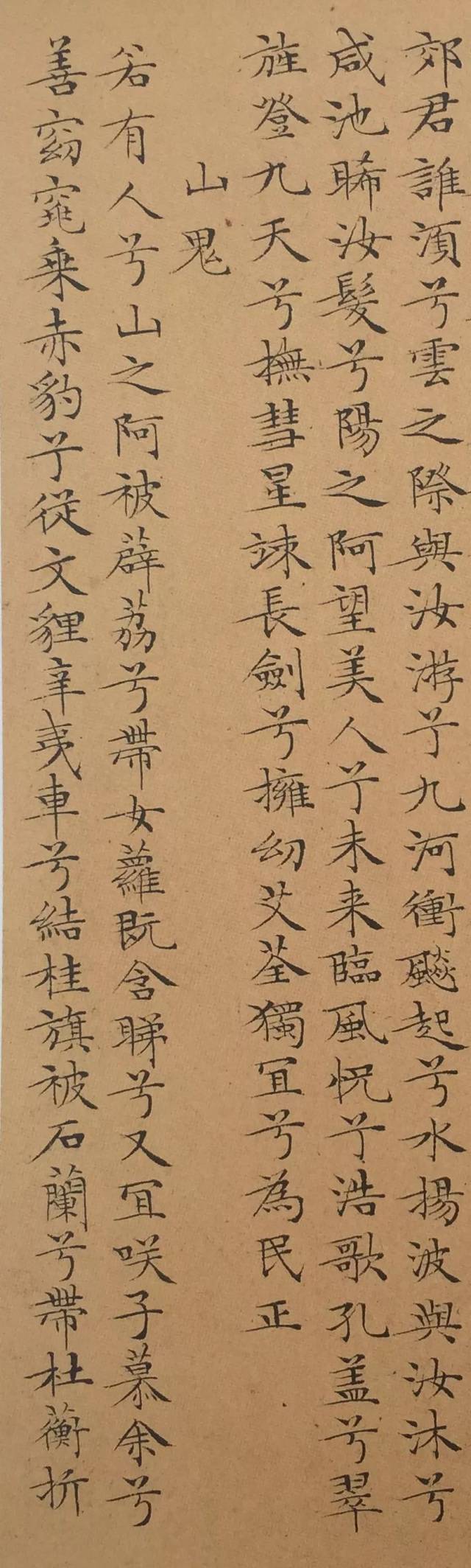 文征明《离骚经 九歌等》册,内容为屈原《离骚经》、《九歌》六首(东皇太一、云中君、湘君、湘夫人、司命、山鬼)《九章》一首(涉江)、及《卜居》、《渔父》。其书写风格风格渊源主要因受到钟繇《宣示表》、王羲之《黄庭》、以及元代倪瓒风格之影响,与北京故宫博物院藏84 岁所书《过秦论》笔法最为接近。而此册独到之处还在于,从章法上讲,他不像平时那样画界格来书写,而整体端雅整齐,行气自然流贯;结体则横向舒展,于平正之中求意态,在此正好印证了他自己的说法:“小字贵开阔,字内间架,宜明整开阔,一如大字体段。”运笔则工稳沉静,从容不迫,于整练之中,虚和舒徐之气浮现毫端,尤其横画起笔细若针尖麦芒,势若游丝飘忽于晴空。通篇字形大小如一,确如蝇头,乃属其小楷作品现存传世最小者,足见其工夫之炉火纯青,让人想象其明窗净几之下神怡务闲之况。