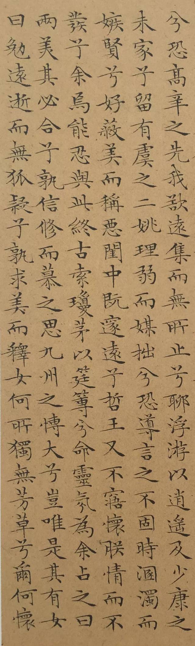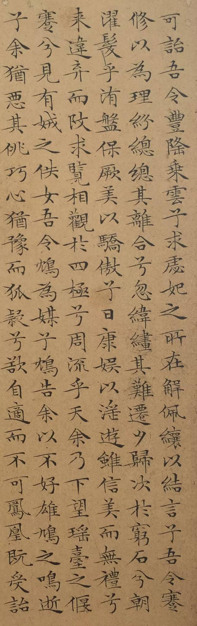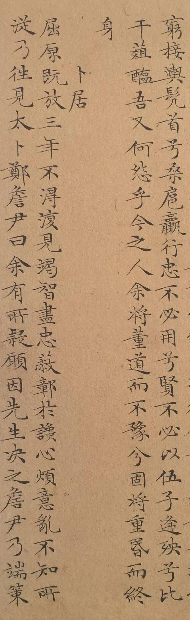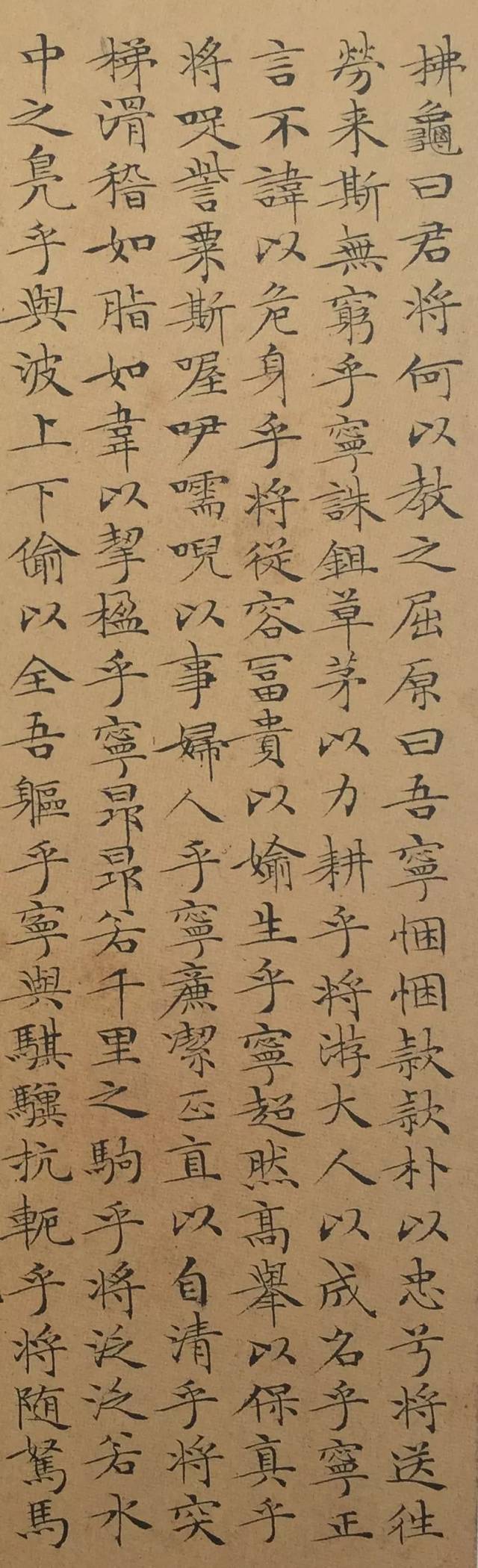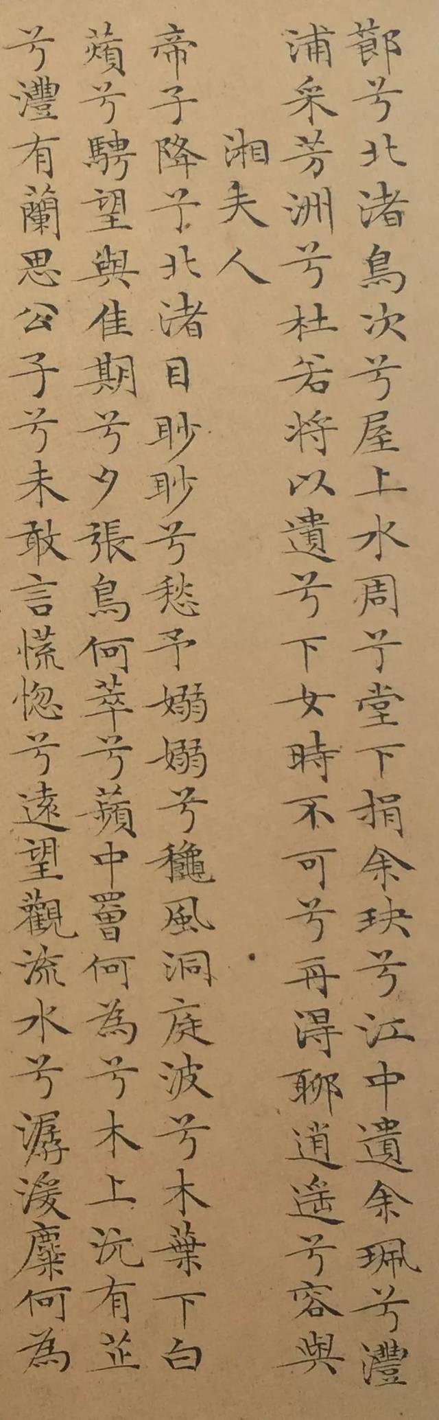 文征明《离骚经 九歌等》册,内容为屈原《离骚经》、《九歌》六首(东皇太一、云中君、湘君、湘夫人、司命、山鬼)《九章》一首(涉江)、及《卜居》、《渔父》。其书写风格风格渊源主要因受到钟繇《宣示表》、王羲之《黄庭》、以及元代倪瓒风格之影响,与北京故宫博物院藏84 岁所书《过秦论》笔法最为接近。而此册独到之处还在于,从章法上讲,他不像平时那样画界格来书写,而整体端雅整齐,行气自然流贯;结体则横向舒展,于平正之中求意态,在此正好印证了他自己的说法:“小字贵开阔,字内间架,宜明整开阔,一如大字体段。”运笔则工稳沉静,从容不迫,于整练之中,虚和舒徐之气浮现毫端,尤其横画起笔细若针尖麦芒,势若游丝飘忽于晴空。通篇字形大小如一,确如蝇头,乃属其小楷作品现存传世最小者,足见其工夫之炉火纯青,让人想象其明窗净几之下神怡务闲之况。