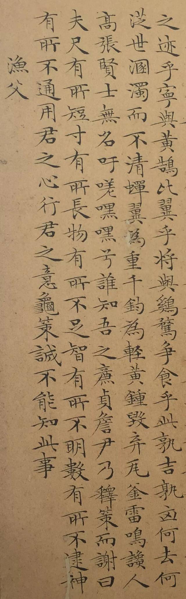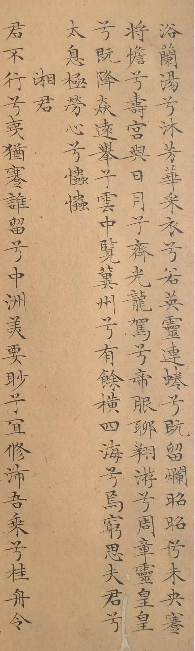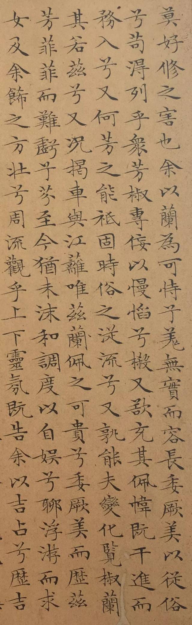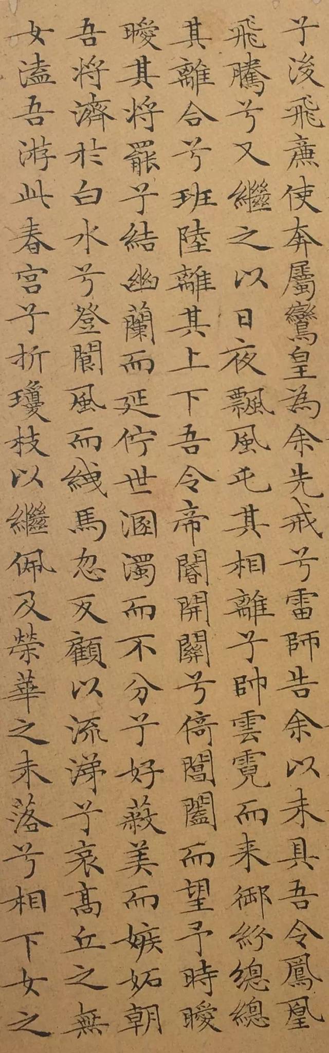 文征明《离骚经 九歌等》册,内容为屈原《离骚经》、《九歌》六首(东皇太一、云中君、湘君、湘夫人、司命、山鬼)《九章》一首(涉江)、及《卜居》、《渔父》。其书写风格风格渊源主要因受到钟繇《宣示表》、王羲之《黄庭》、以及元代倪瓒风格之影响,与北京故宫博物院藏84 岁所书《过秦论》笔法最为接近。而此册独到之处还在于,从章法上讲,他不像平时那样画界格来书写,而整体端雅整齐,行气自然流贯;结体则横向舒展,于平正之中求意态,在此正好印证了他自己的说法:“小字贵开阔,字内间架,宜明整开阔,一如大字体段。”运笔则工稳沉静,从容不迫,于整练之中,虚和舒徐之气浮现毫端,尤其横画起笔细若针尖麦芒,势若游丝飘忽于晴空。通篇字形大小如一,确如蝇头,乃属其小楷作品现存传世最小者,足见其工夫之炉火纯青,让人想象其明窗净几之下神怡务闲之况。