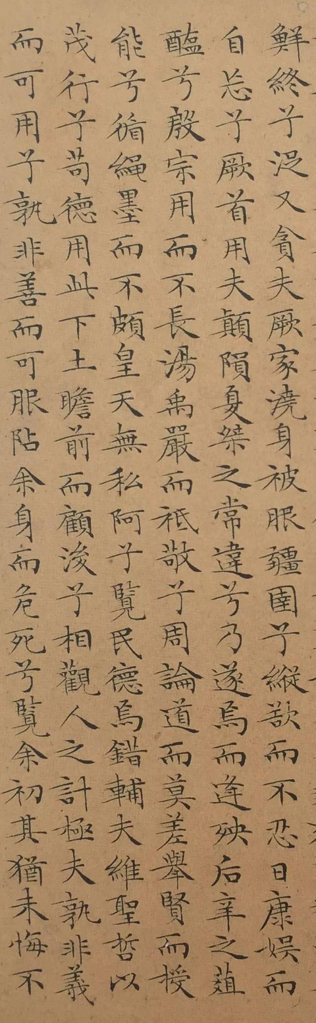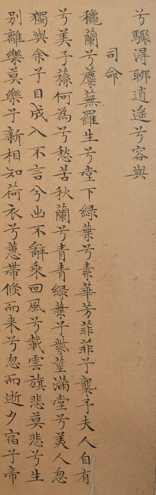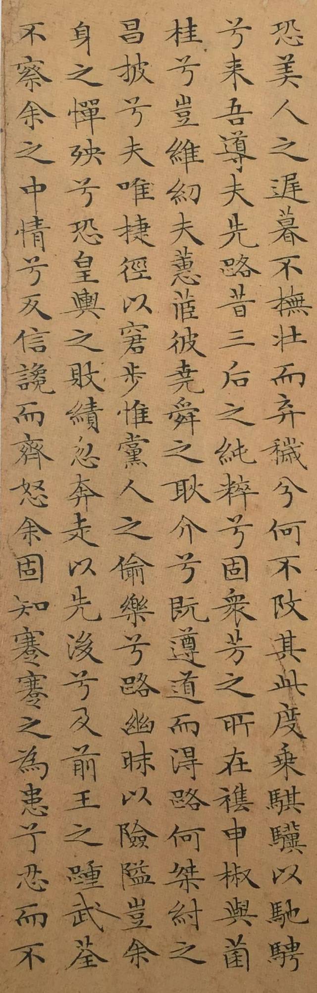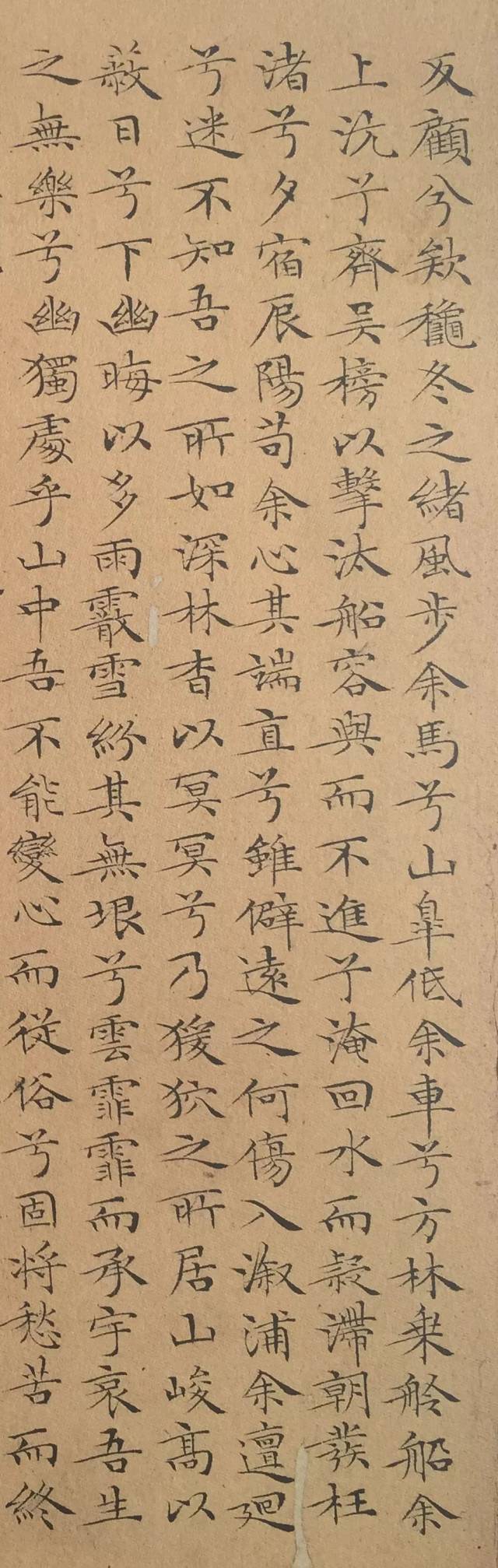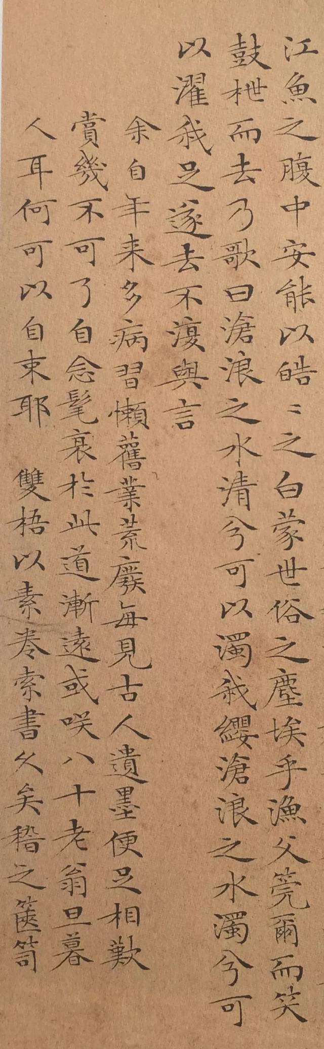 文征明《离骚经 九歌等》册,内容为屈原《离骚经》、《九歌》六首(东皇太一、云中君、湘君、湘夫人、司命、山鬼)《九章》一首(涉江)、及《卜居》、《渔父》。其书写风格风格渊源主要因受到钟繇《宣示表》、王羲之《黄庭》、以及元代倪瓒风格之影响,与北京故宫博物院藏84 岁所书《过秦论》笔法最为接近。而此册独到之处还在于,从章法上讲,他不像平时那样画界格来书写,而整体端雅整齐,行气自然流贯;结体则横向舒展,于平正之中求意态,在此正好印证了他自己的说法:“小字贵开阔,字内间架,宜明整开阔,一如大字体段。”运笔则工稳沉静,从容不迫,于整练之中,虚和舒徐之气浮现毫端,尤其横画起笔细若针尖麦芒,势若游丝飘忽于晴空。通篇字形大小如一,确如蝇头,乃属其小楷作品现存传世最小者,足见其工夫之炉火纯青,让人想象其明窗净几之下神怡务闲之况。