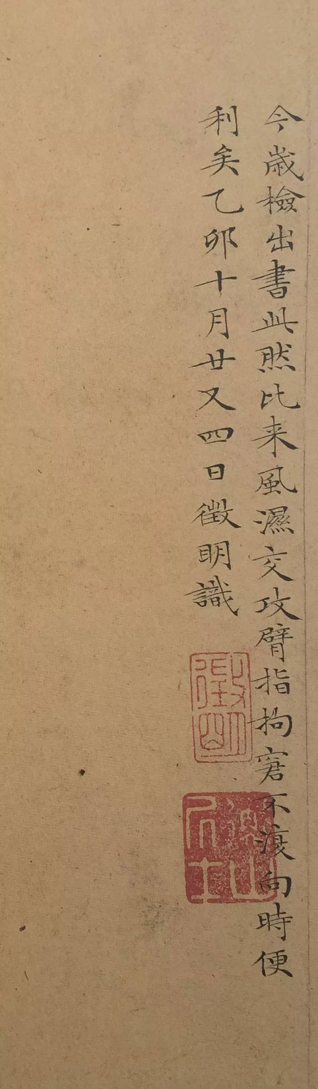 此小楷《离骚经九歌等》册, 第一开作者钤有“停云”白文印、末开钤“征明”朱文长方印、“衡山居士”白文印。篇后作者跋曰:“余自年来多病习懒,旧业荒废。每见古人遗墨,便足相叹赏,几不可了。自念髦衰,于此道渐远,或笑八十老翁旦暮人耳,何可以自束耶?双梧以素卷书久矣,稽之箧笥,今岁检出书此。然比来风湿交攻,臂指拘窘,不复向时便利矣。”类似的修辞方式,在故宫博物院藏《赤壁赋》页后的跋语上我们也可以读到,乃是文征明应酬友人时一种常见的自谦套语。