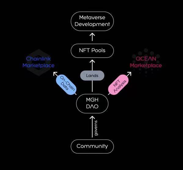 算法和预言机共同为 MGH DAO 金库提供了一个复杂的收入模型,并可以根据社区投票将资金再投资到元宇宙的进一步投资管理中。通过Chainlink 的基础设施,该算法将连接到一个预言机,以便将数据馈送到愿意与之交互的任何类型的智能合约。从这个意义上说,MGH DAO 将成为首批提供基于 AI 的 NFT 估值的项目之一,从而解决 MetaFi 的最大痛点之一:Metaverse (元宇宙)和DeFi (去中心化金融)的融合。 在Sandbox 和 Decentraland 等元宇宙中,逐步增强各种 NFT 资产的评估,例如艺术收藏品和游戏资产,创建一个高效的金融化层,这将有助于在各个元宇宙内的所有部门之间建立共同的经济基础。